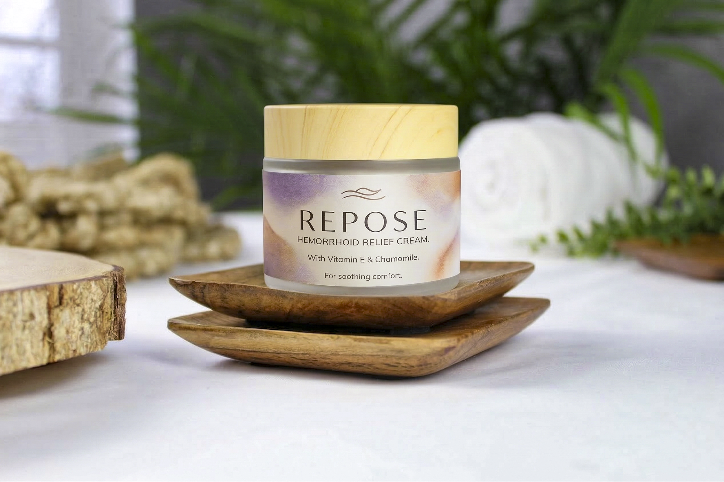 Staging this on a wooden soap dish with rolled white towels and ferns in the background provides the perfect spa ambience. It looks exactly like an editorial shot for a luxury facial treatment, which makes the word "Hemorrhoid" hit so much harder when the viewer actually reads it.