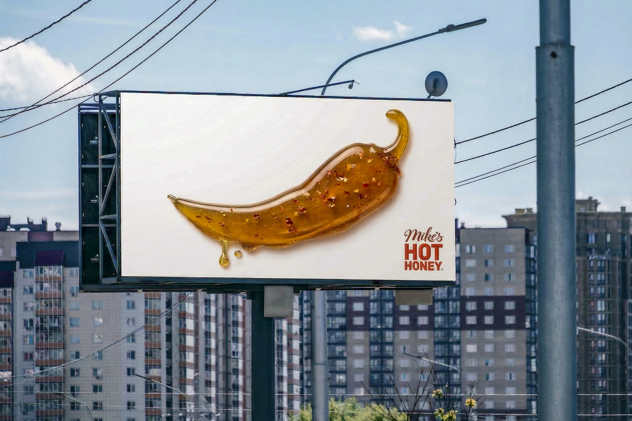 Mike’s Hot Honey is defined entirely by the collision of two distinct ingredients: pure sweetness and raw heat. Instead of explaining the flavor profile with a clever headline, I decided to show it. The goal was to create a visual shorthand for the brand that was instantly recognizable from a moving vehicle.